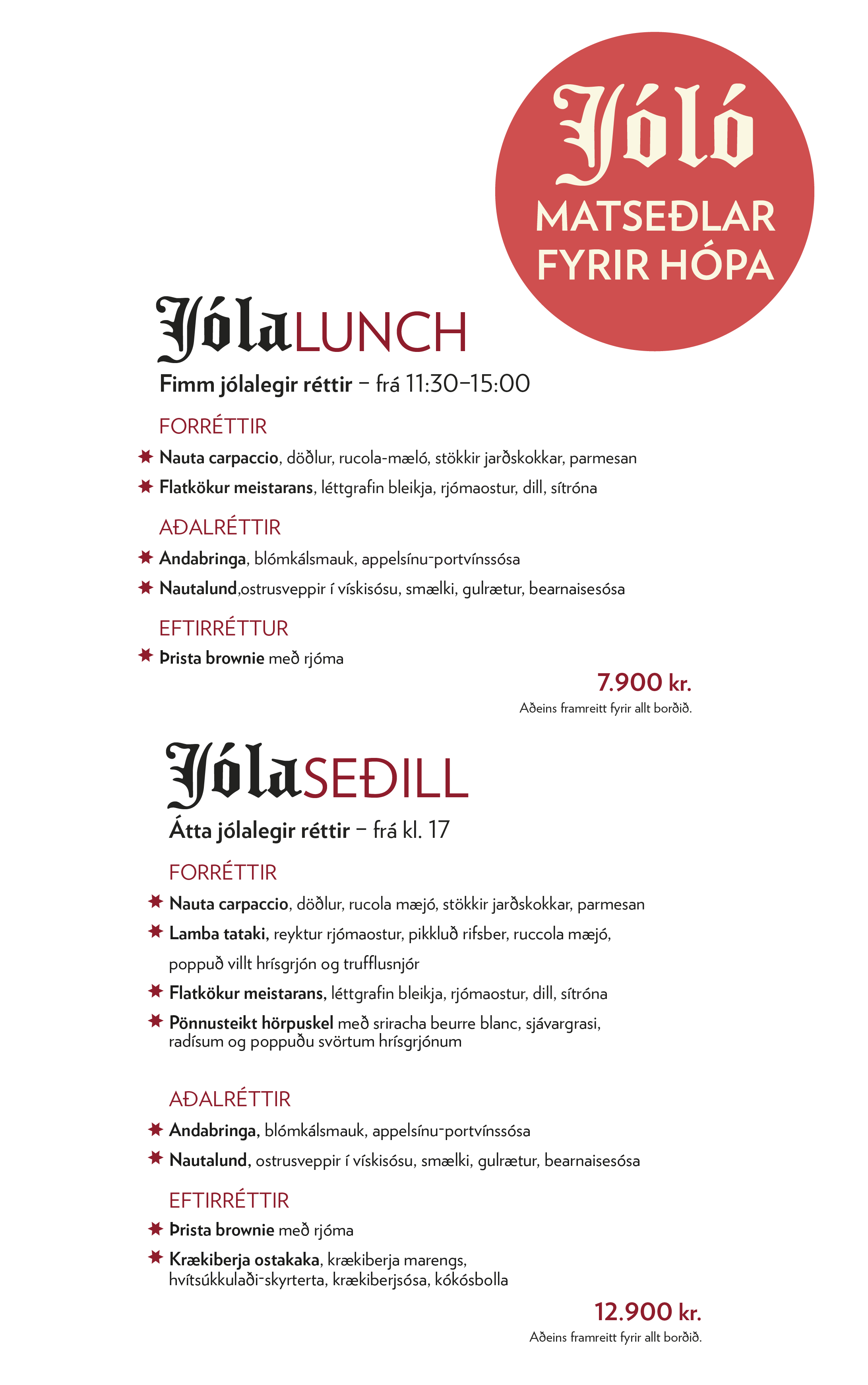 Jólaseðlar eru í boði frá miðvikudeginum 12. nóvember fyrir hópa 8 manns eða fleiri.
